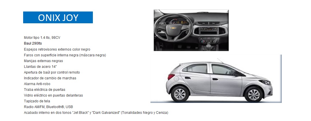 Equipamento: Potenciá tu actitud con Chevrolet Onix Joy que, además de destacarse por su diseño juvenil y moderno, te ofrece una óptima autonomía, un desempeño equilibrado y el máximo confort interior.